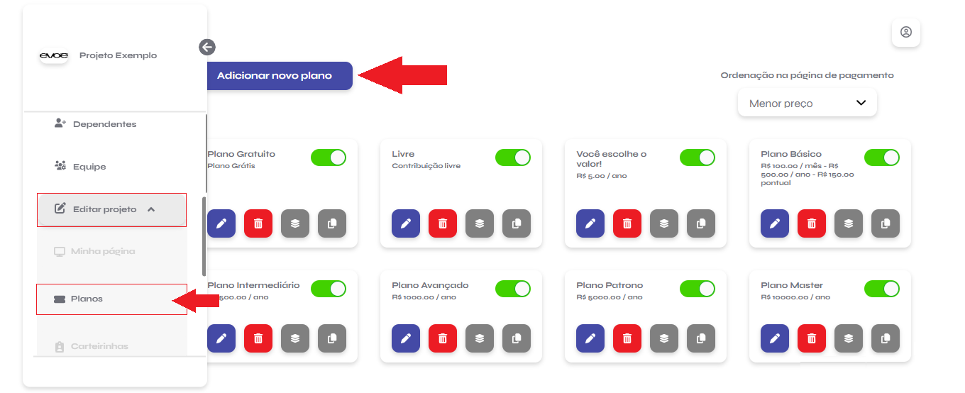 Ativar ou desativar um plano: clique na chave localizada ao lado do plano.