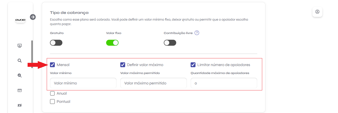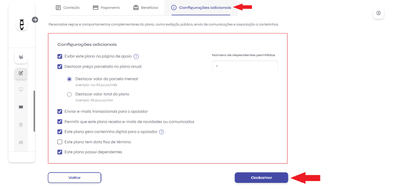 - Exibir plano na página de apoio: defina se o plano será público ou oculto (ainda pode ser usado internamente).