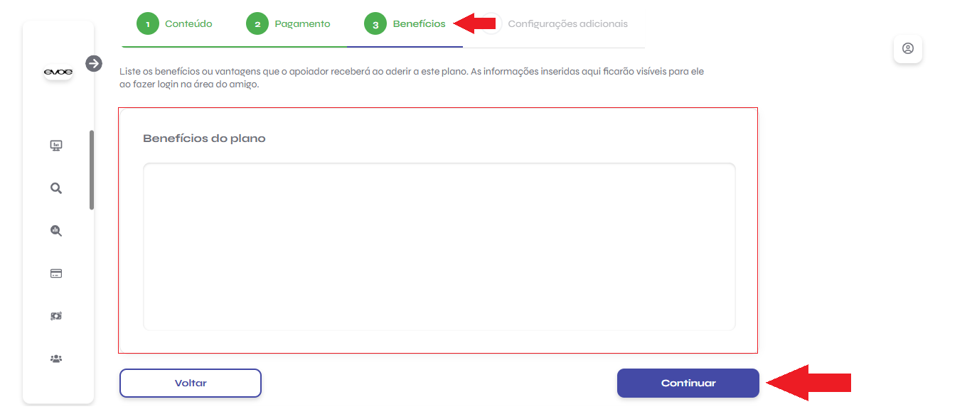 Liste os benefícios ou vantagens que o apoiador receberá ao aderir a este plano. As informações inseridas aqui ficarão visíveis para ele ao fazer login na área do amigo.