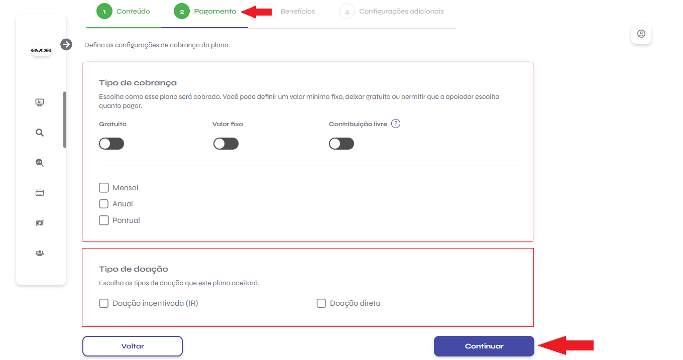 Este guia mostra como criar, configurar e gerenciar planos dentro da plataforma Evoé. Siga o passo a passo abaixo para estruturar os planos de apoio do seu projeto e oferecer benefícios claros aos seus apoiadores.