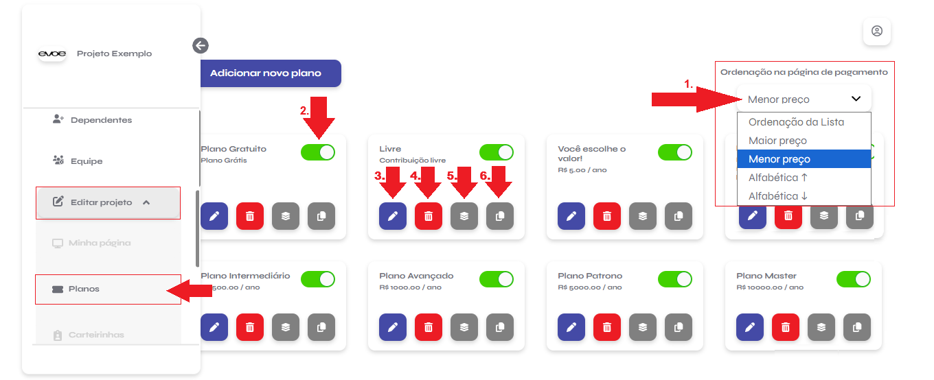 Ordenação na página de pagamento: Escolha como os planos serão exibidos aos apoiadores, de acordo com a estratégia do seu projeto. As opções de ordenação disponíveis são: