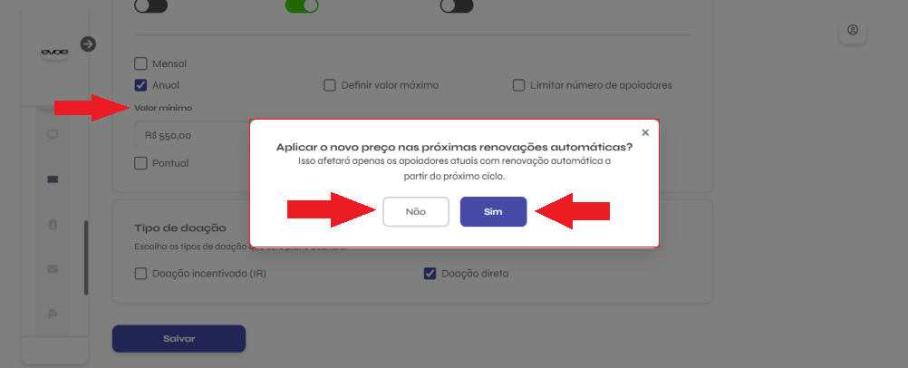 Ao alterar o valor de um plano que já possui apoiadores, será exibida uma caixa de diálogo:
