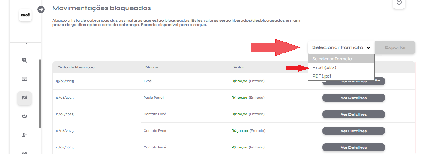 Escolha o formato de exportação (PDF ou Excel). Para isso, clique no botão “Selecione formato” no canto direito da página.